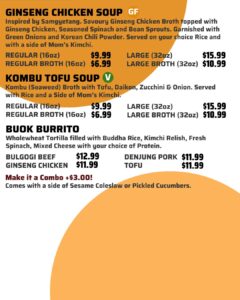 Choose from Bulgogi Beef or Denjung Pork or Ginseng Chicken or Tofu